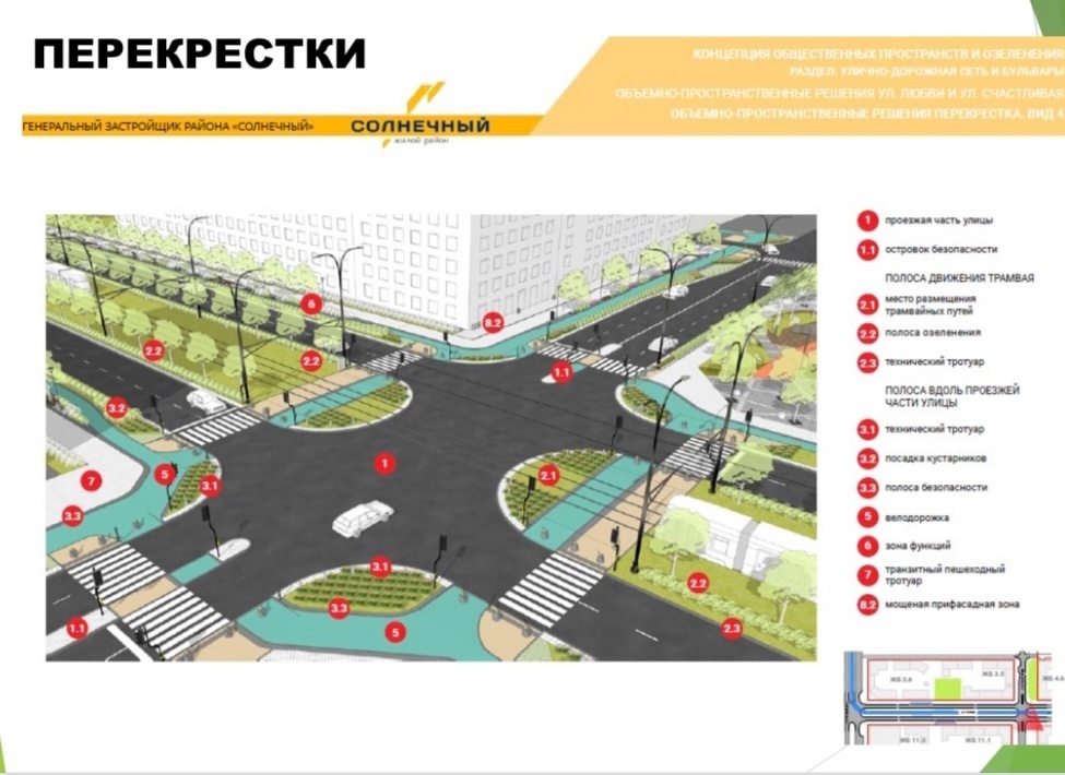 Стандарт благоустройства перекрестков микрорайона эконом класса Солнечный в городе Екатеринбурге предусматривает обязательно применение кустарников и многолетников!